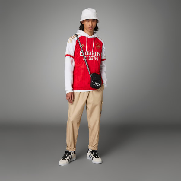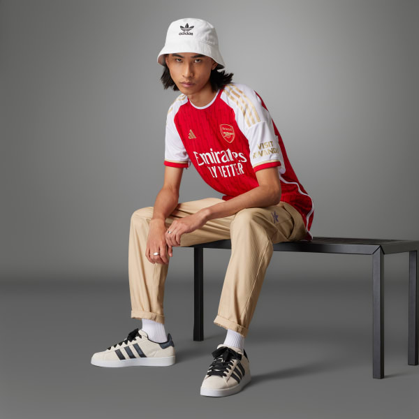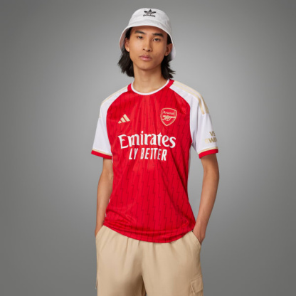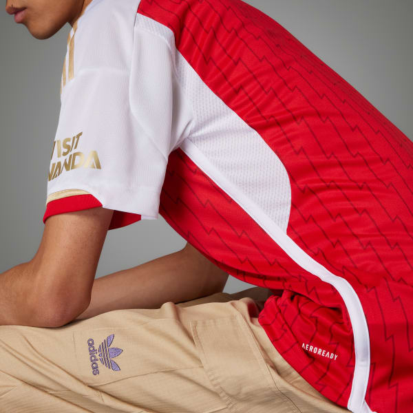 They say lightning never strikes twice. And 20 years on, the Gunners remain the only club to finish an English top-flight soccer season undefeated. The Arsenal 23/24 Home Jersey celebrates the team's unique anniversary with lightning bolts and gold details. Created for loyal club supporters, the jersey features sweat-wicking AEROREADY technology to keep you feeling dry, while a woven badge shows off your team pride. Made with 100% recycled materials, this product represents just one of our solutions to help end plastic waste.