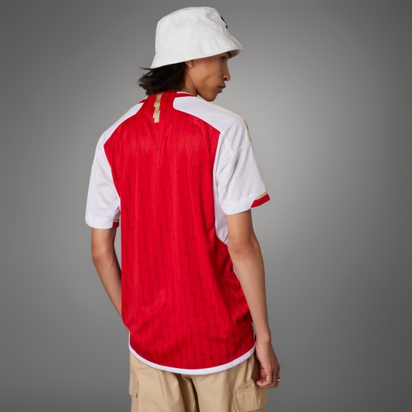 A CELEBRATORY ARSENAL FAN JERSEY WITH LIGHTNING BOLTS AND GOLD DETAILS.