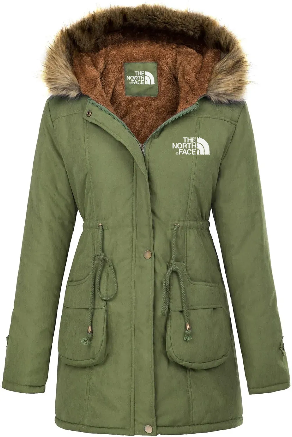 - Features: Fixed hood with faux fur trim; Main body Lined with fleece; Padded with silk wadding; Chunky design; Drawstring waist; Two open pockets on the front; Front zipper and snap button closure.